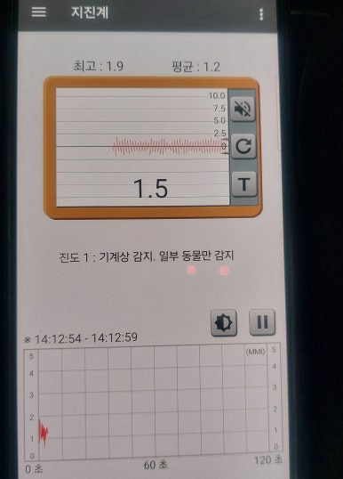 스마트폰 지진계 앱으로 수치를 체크했습니다.